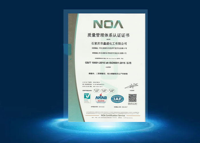 Los productos de Xinsheng Chemical se venden bien en China y en el extranjero bajo la marca Meiyu.Serie de tripolifosfato de aluminio y serie de fosfato de aluminio, que se utilizan ampliamente en pinturas anticorrosivas de ferrocarriles, automóviles, buques, etc. Xinsheng Chemical tiene una capacidad anual de 1200 toneladas de la serie de fosfato de zinc,720 toneladas de la serie de tripolifosfato de aluminioLos productos cumplen con las normas nacionales, el registro REACH, los requisitos de la norma ROHS, las pruebas SG y el sistema de certificación ISO9001.